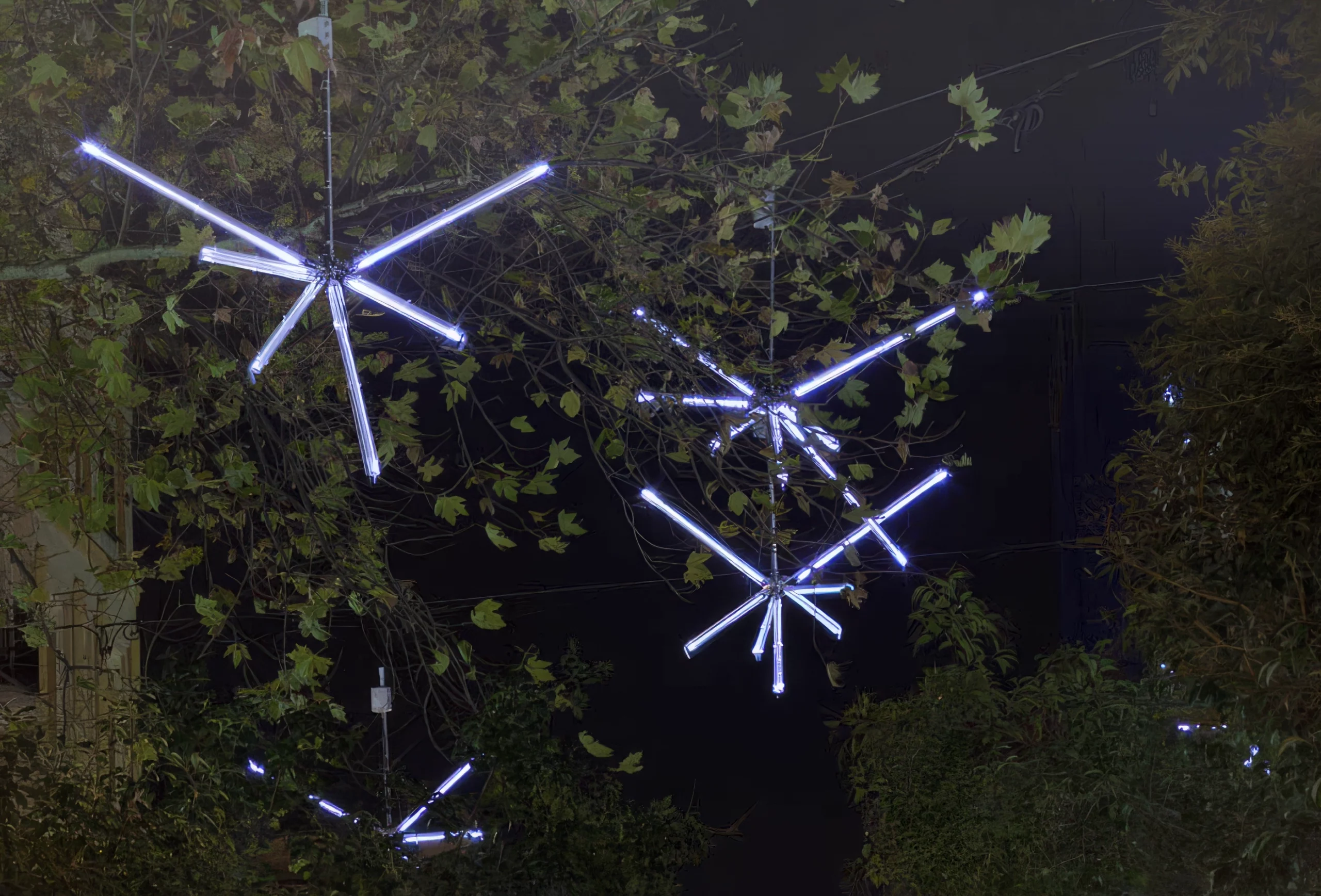 Instalada en las calles Fuencarral y Montera, la propuesta concebía la luz como un instante de celebración suspendido en el aire. Sobre la noche madrileña, el diseño desplegaba una constelación dinámica de puntos lumínicos que evocaban la explosión efímera de los fuegos artificiales, transformando el recorrido urbano en una experiencia vibrante y emocional.